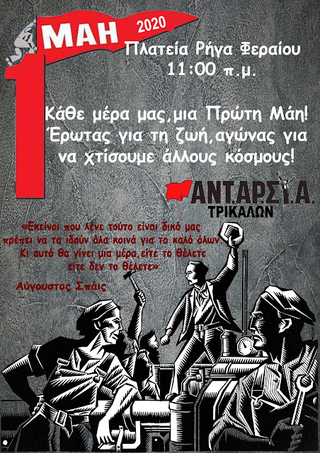 Στηρίζουμε και συμμετέχουμε στην απεργιακή, ταξική, Πρωτομαγιάτικη συγκέντρωση που διοργανώνουν εργατικά σχήματα και συλλογικότητες του νομού, στην πλατεία Ρήγα Φεραίου στις 11 π.μ., τηρώντας όλα τα απαραίτητα μέτρα προφύλαξης.